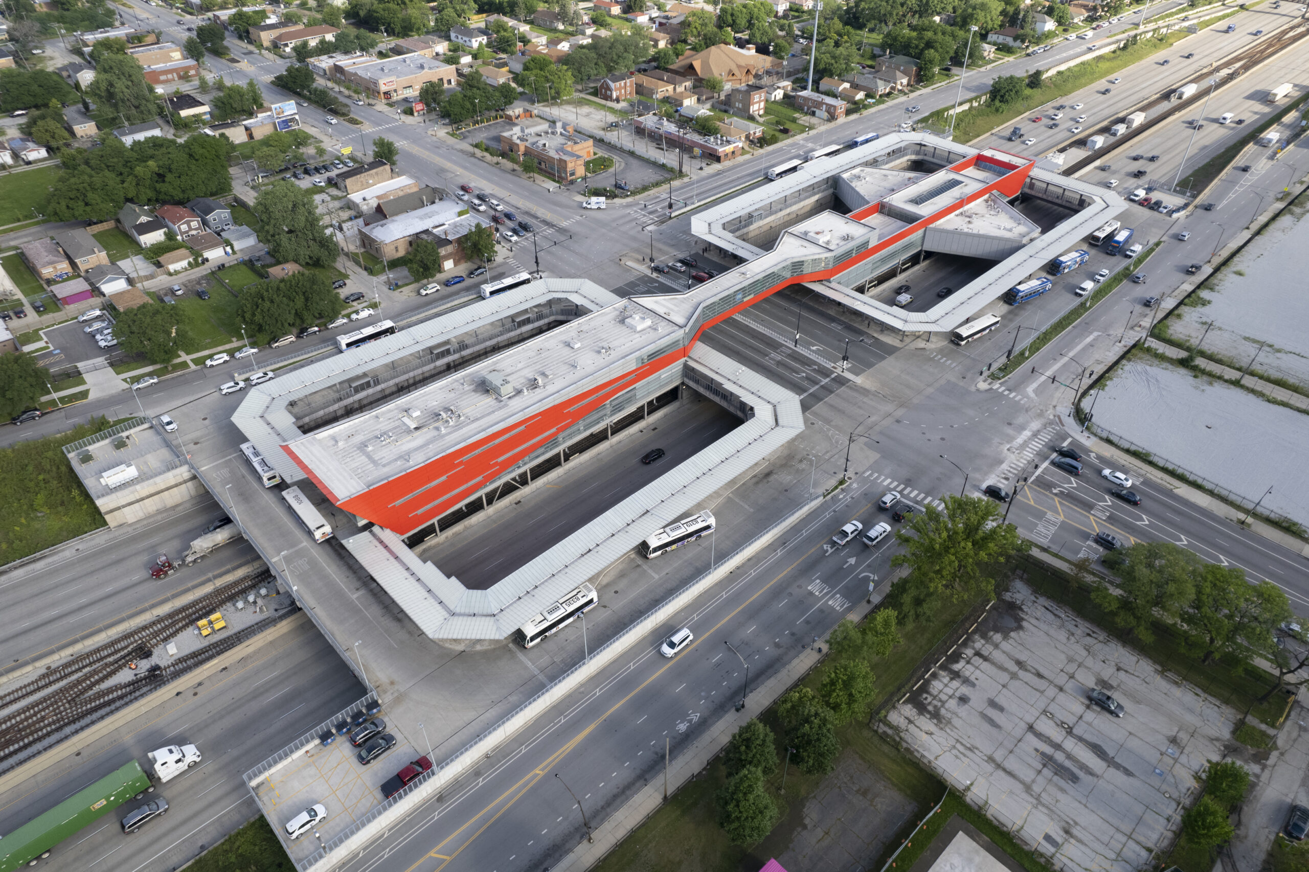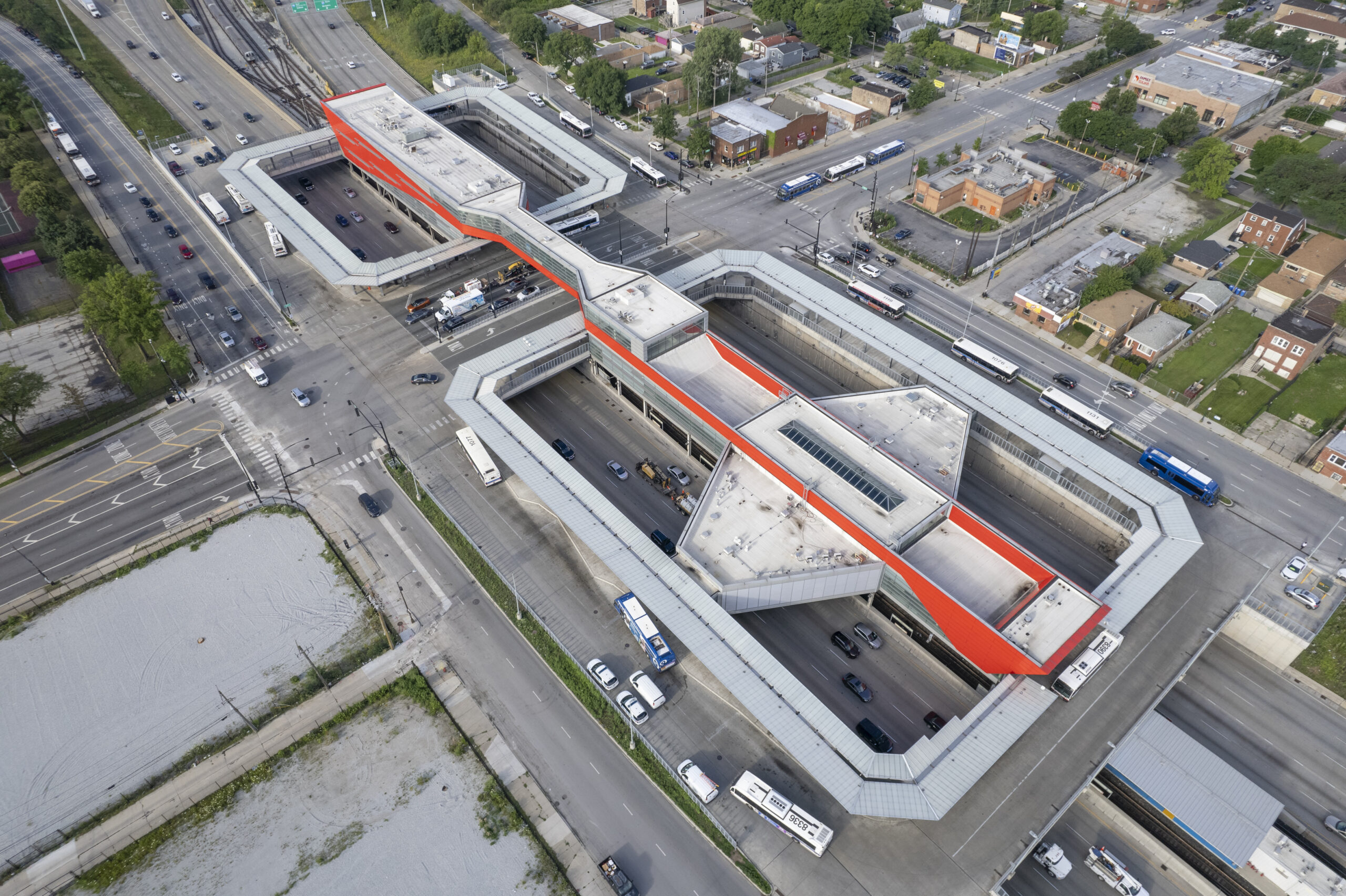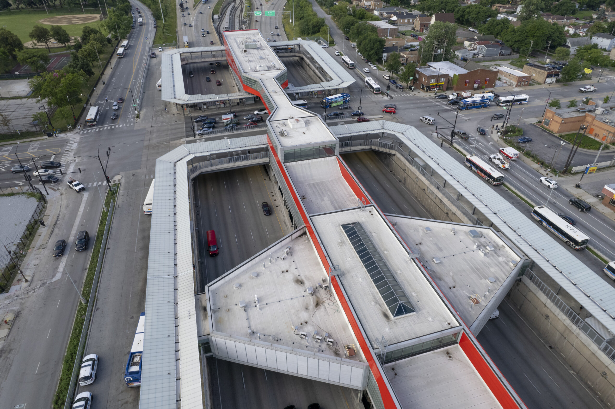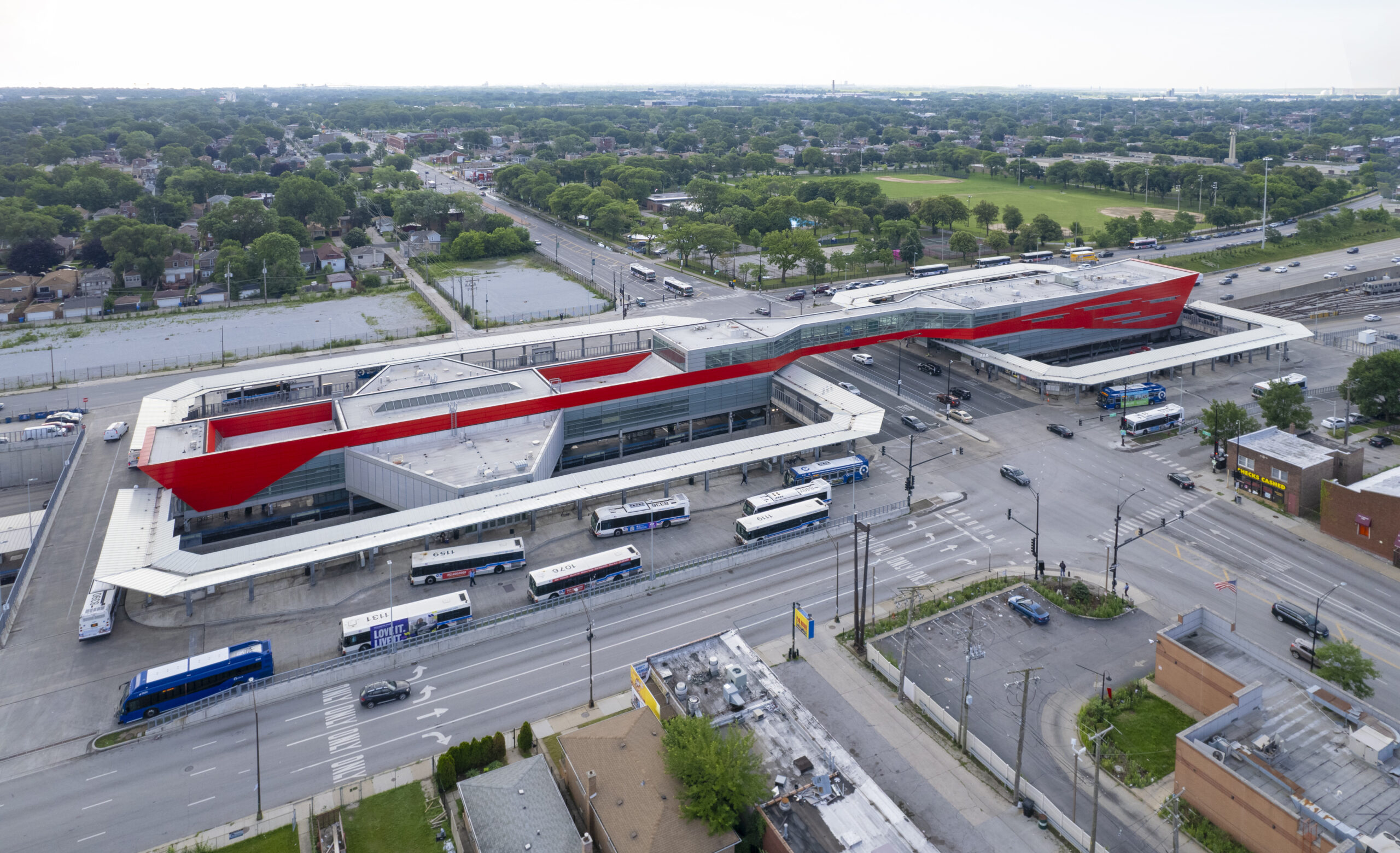 Pinto constructed the large-scale bus turnaround canopy above the expressway at the 95th Street Red Line terminal—one of the busiest in the CTA system. The work supported a multi-year modernization effort, helping improve pedestrian flow, weather protection, and transit efficiency in this critical South Side transportation corridor.