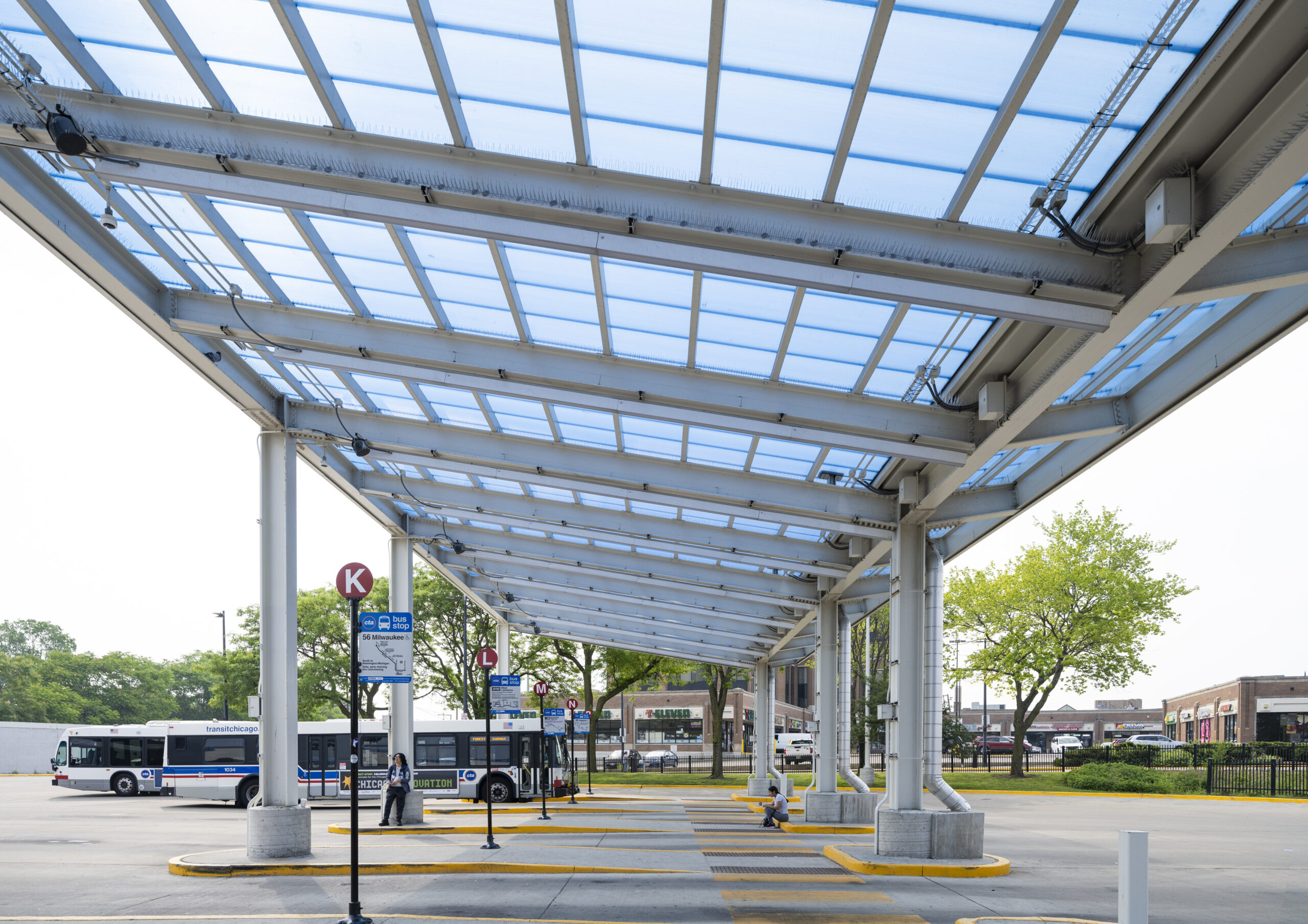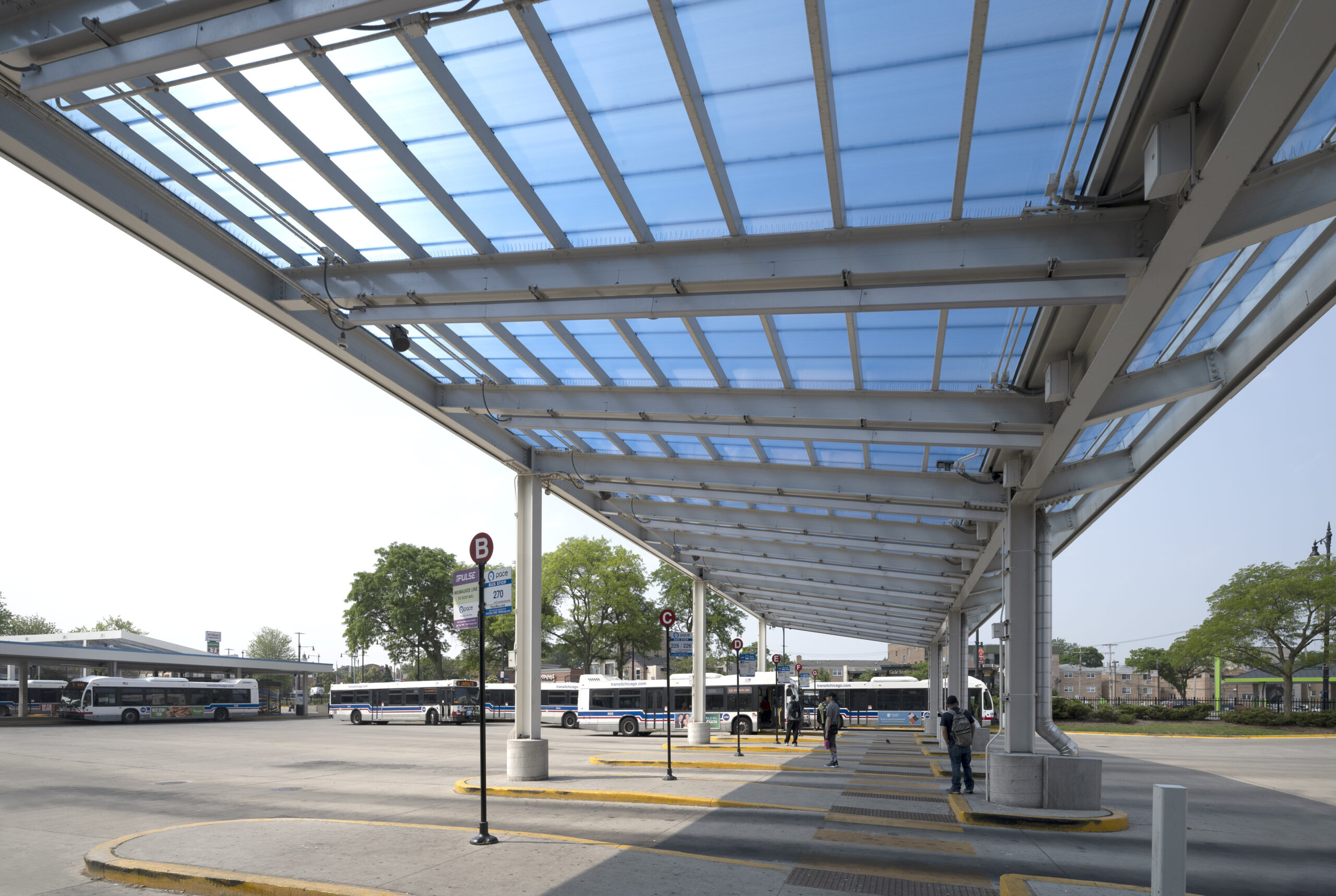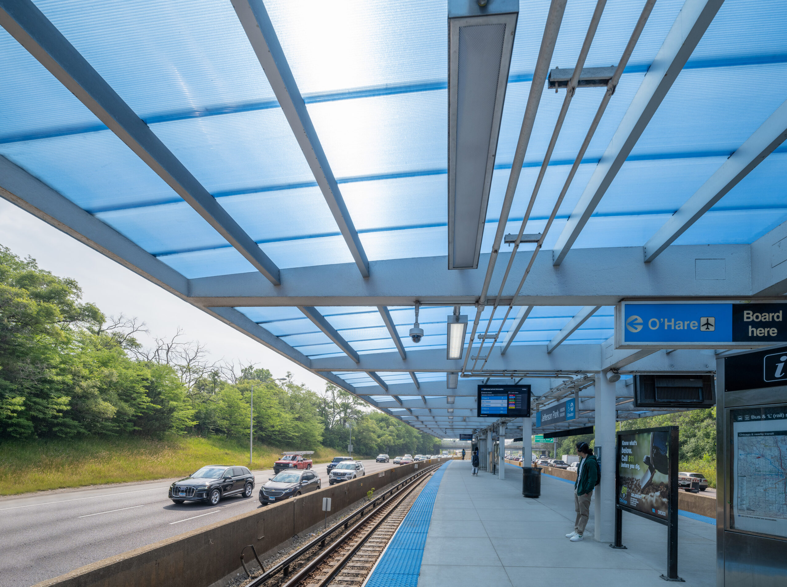 Pinto Construction Group completed extensive structural and architectural work at this major intermodal hub, including the platform canopy constructed over the expressway median, bus turnaround canopies, and a specialty ceiling at the station entrance. Additional scope included aluminum composite material (ACM) panel installation on the station façade and stainless steel paneling at the portal entrance, all executed with precision to meet CTA specifications and improve the public-facing aesthetic.